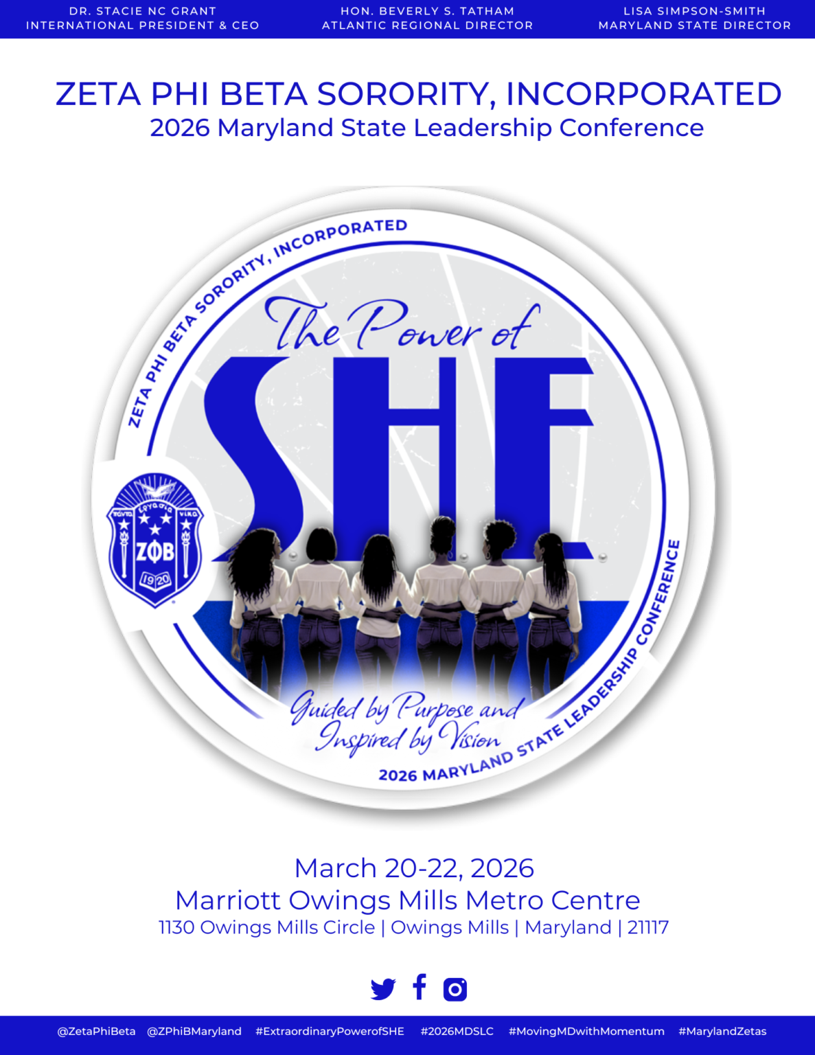 On behalf of the State of Maryland Executive Boards—both Zeta and Amicae; State of Maryland Amicae President Rania Fitchett; the MDSLC Volunteer Chapters, Beta Alpha Beta Zeta, Beta Alpha Sigma Zeta, Beta Alpha Tau Zeta, Gamma Alpha Eta Zeta, and Epsilon Alpha Phi Zeta and the entire MDSLC Planning Committee, I look forward to seeing you at the 2026 Maryland State Leadership Conference!
