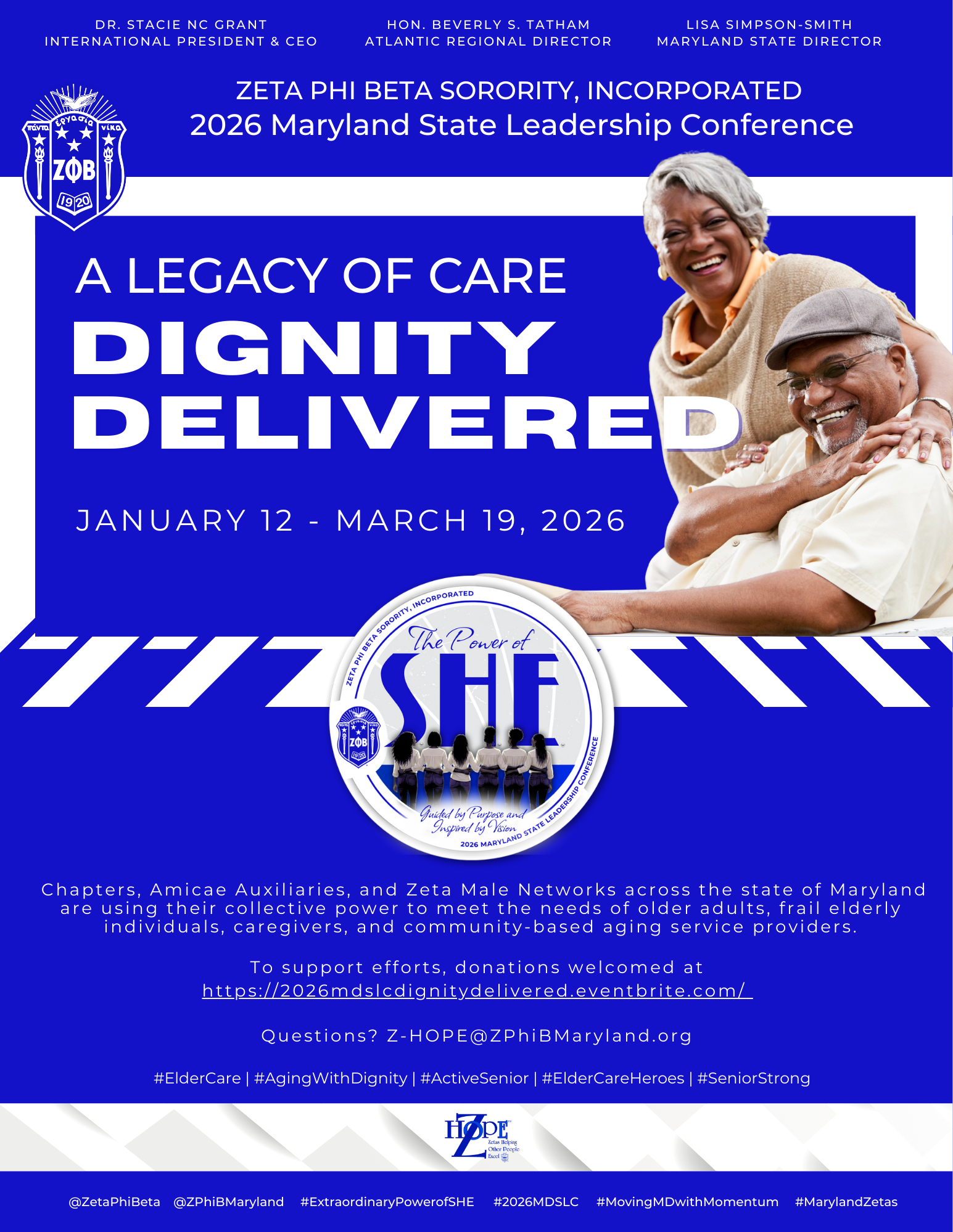 Chapters and Auxiliaries in the State of Maryland will galvanize as a State under Zeta’s Power of S.H.E. to address a full multi-layered impact with Social, Health, and Economic Justice affecting older adults by empowering and delivering dignity.